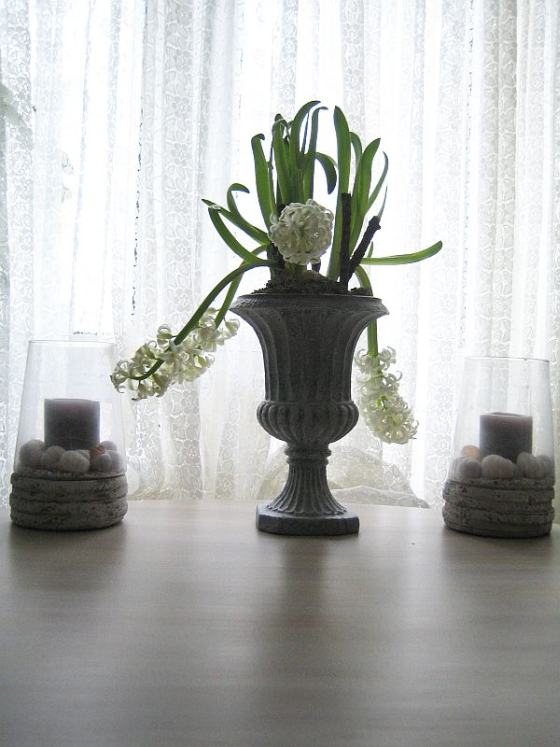 This winter was Siberian cold here, and we were the whole time blocked at home. I desperately wanted to have a little bit of spring feeling, so I started searching inside the carton boxes I use to gather all the unused decoration elements from the years past. I came across a couple of sea snail shells, and since I had a couple of Hyacinths in a small vase i put them together inside a bigger wave, adding some moss. The final effect was better than I though, and it did indeed give me a warm feeling of Spring coming.