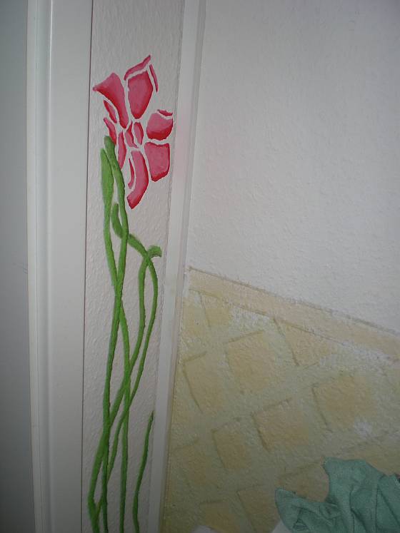 Convert your small and claustrophobic toilet into a summer oasis! Using free-hand drawing techniques and stencils I was able to recreate a summer garden atmosphere inside a small cramped toilet. Entering the small ambient, claustrophobia is immediately replaced by a feeling of relaxation and nature contemplation, thanks to the realistic recreation of flowers and plants on all sides, and of a nice summer sky on the ceiling. The circular window hand painted on the wall gives a sense of openness to a world beyond.