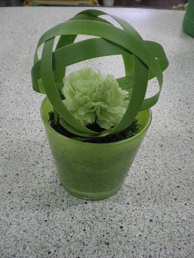 Create with the Aristea 4 small circles, stapling the ends to fix them, taking care that the size is roughly similar as the upper border of your vase. arrange the circles one inside the other, so to create a ball with large gaps in between the leaves.